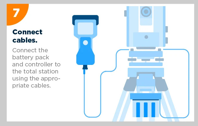 Jika alat Anda menggunakan baterai atau kontroler eksternal, sambungkan kabel-kabel tersebut ke unit Total Station.Nyalakan Alat dan Kontroler