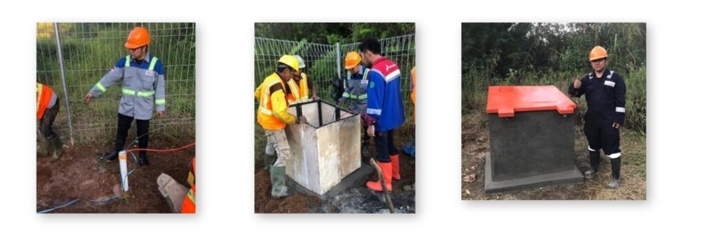 - Instalasi Sensor dan Shelter: Setelah semen mengeras sepenuhnya, sensor C100 dipasang di dalam lubang bor. Sebuah shelter atau pelindung kemudian dipasang di atas lubang bor untuk melindungi peralatan dari cuaca dan faktor eksternal lainnya.