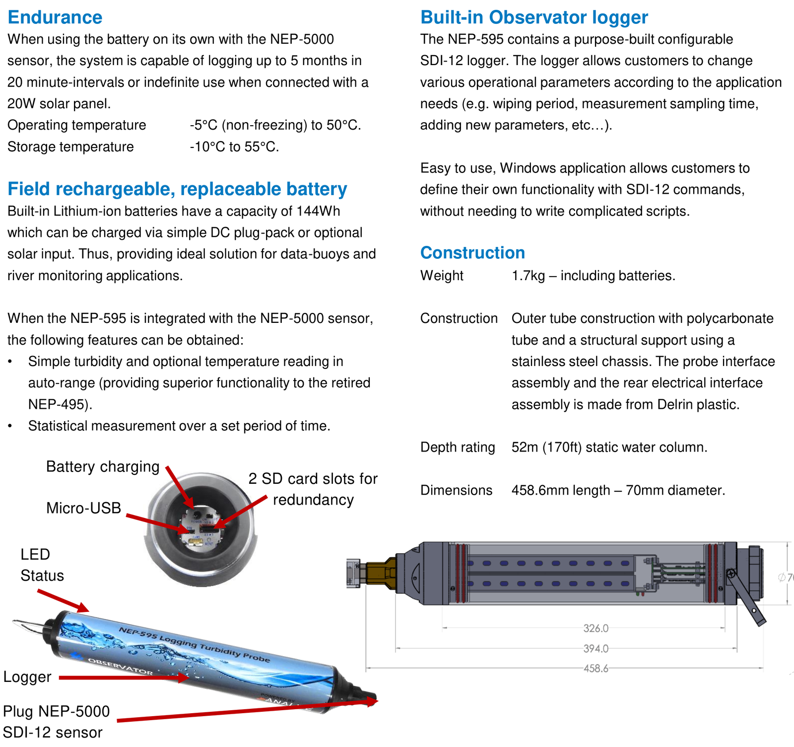 Probe turbiditas Analite NEP-595 dapat memantau dan mencatat kekeruhan dalam paket mandiri yang kokoh yang mudah dipasang dan mudah mengunduh data yang dikumpulkan secara selektif. NEP-595 adalah perangkat lengkap yang berisi pencatat data SDI-12 yang dapat dikonfigurasi dan baterai isi ulang yang dirancang untuk pengoperasian jangka panjang.