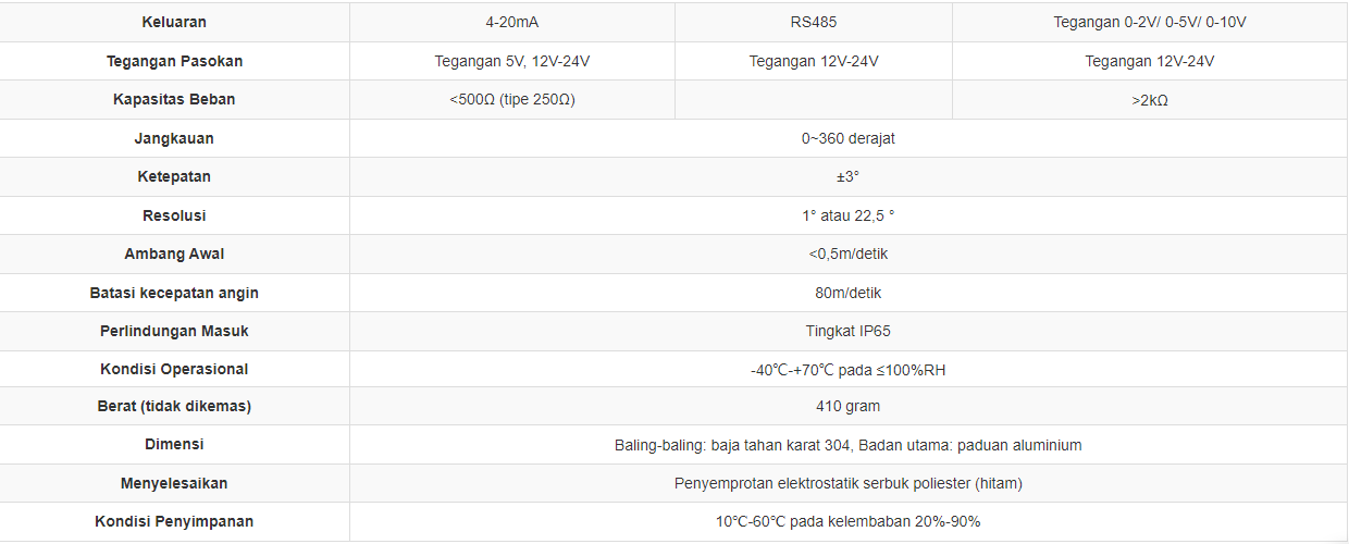 Sensor arah angin RK110-01B Wind Direction Sensor adalah indikator arah angin sensitif yang memberikan indikasi visual arah angin. Sirkuit digital yang mampu menahan RFI & EMI yang kuat dan kompensasi suhu otomatis sudah terpasang. Konstruksi sensor mencerminkan persyaratan keandalan dan daya tahan. Hanya bahan tahan korosi kualitas tertinggi, seperti aluminium berkekuatan tinggi dan baja tahan karat yang digunakan. Sensor ini memiliki ketahanan yang baik terhadap pasir, debu, semprotan garam, dan jamur. Sensor ini ideal untuk studi penilaian sumber daya angin dan aplikasi serupa yang membutuhkan akurasi, keandalan, dan perawatan minimal.