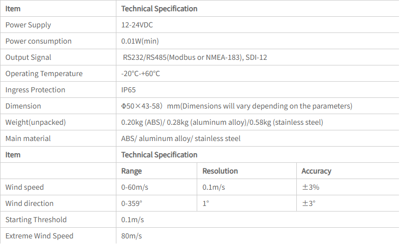 RK120-10 Ultrasonic Wind Speed & Direction Sensor mengukur kecepatan & arah angin dengan menggunakan perbedaan waktu gelombang ultrasonik di udara. Produk ini mengadopsi chip berdaya rendah dan konsumsi daya minimum 0,01W. Ini sangat cocok untuk aplikasi kebutuhan daya tinggi seperti energi matahari atau catu daya baterai. Cangkangnya bisa terbuat dari ABS, paduan aluminium atau baja tahan karat. Permukaan diperlakukan dengan ketahanan oksidasi khusus, ketahanan korosi dan dapat digunakan di lingkungan yang berbeda.
