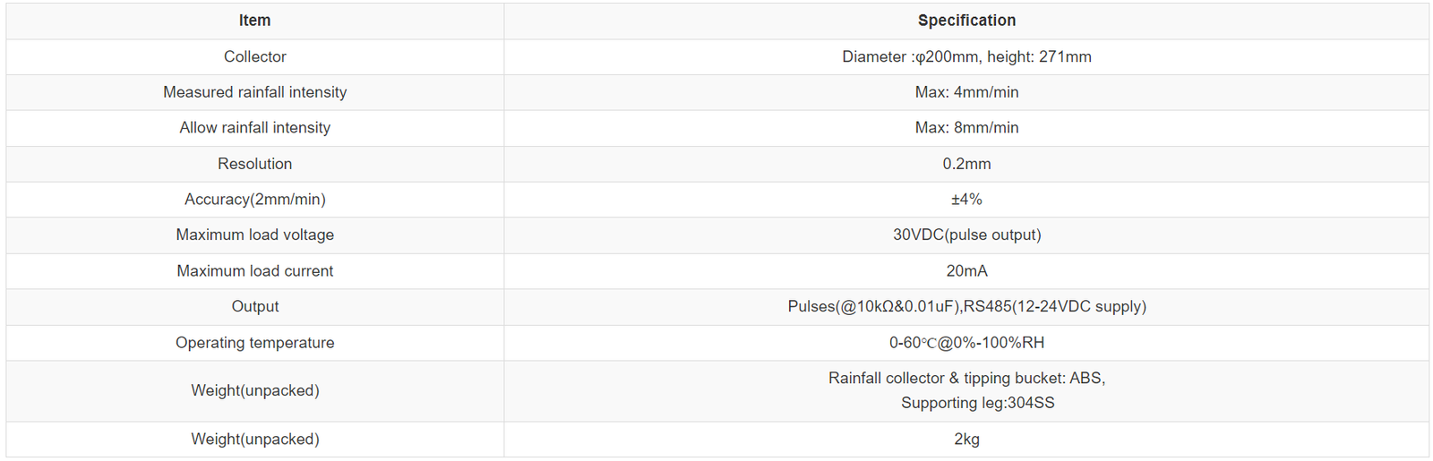 RK400-04 Economical Plastic Tipping Bucket Rain Gauge Sensor adalah instrumen hidrologi dan meteorologi yang digunakan untuk mengukur sifat curah hujan, dan mengubah curah hujan menjadi keluaran sinyal pulsa. Didesain dengan jaring anti serangga, nosel pemblokiran bebas, dan penyamarataan bawaan. Model ini dapat digunakan dalam meteorologi, hidrologi, pertanian, kehutanan, stasiun pemantauan lapangan, dan industri lainnya. Dikombinasikan dengan pencatat curah hujan dapat digunakan untuk mengukur curah hujan, intensitas curah hujan, waktu curah hujan.