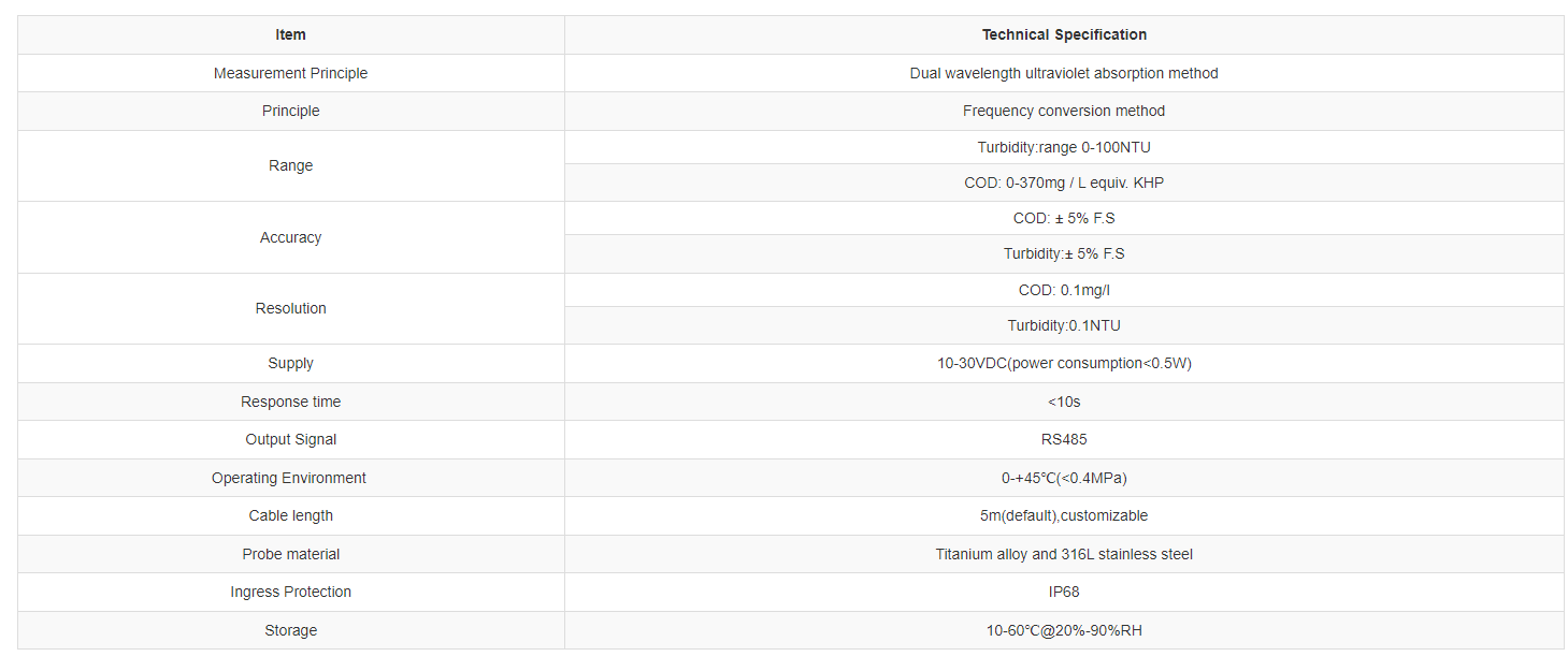 Sebagian besar bahan organik yang terlarut dalam air bersifat menyerap sinar ultraviolet. Oleh karena itu, kandungan polutan organik terlarut dalam air dapat diukur secara akurat dengan mengukur sejauh mana bahan organik ini menyerap sinar UV pada 254nm. RK500-25 COD Sensor mengadopsi dua sumber cahaya, satu sinar ultraviolet untuk mengukur kandungan COD dalam air dan yang lainnya adalah cahaya referensi untuk mengukur kekeruhan dalam air. Redaman jalur optik dikompensasi oleh algoritma tertentu, yang dapat menghilangkan gangguan pengotor partikel tersuspensi pada hasil pengukuran hingga batas tertentu, sehingga membuat hasil pengukuran lebih stabil dan dapat diandalkan.
