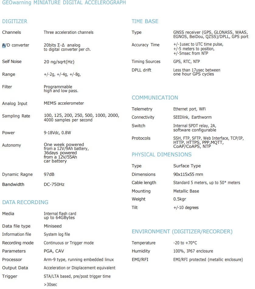 GEOwarning adalah akselograf digital yang ringkas dan sangat hemat biaya. Alat ini mengintegrasikan akselerometer MEMS 3 sumbu, pengubah sinyal digital 20-bit, sistem operasi Linux tertanam, serta sinkronisasi waktu melalui GPS atau NTP. Server Seedlink dan Earthworm yang tertanam di dalamnya memastikan telemetri data waktu nyata yang andal, sementara kapasitas penyimpanan yang besar memungkinkan pencatatan data lokal dalam jangka waktu yang lama. Instrumen ini memiliki konsumsi daya yang sangat rendah sehingga dapat beroperasi hanya dengan catu daya dari baterai 12Vdc kecil. Karena ukurannya yang kecil serta fleksibilitas dalam komunikasi (Ethernet atau WiFi) dan waktu sinkronisasi (GPS atau NTP), alat ini sangat mudah dipasang pada bangunan dan struktur lainnya.