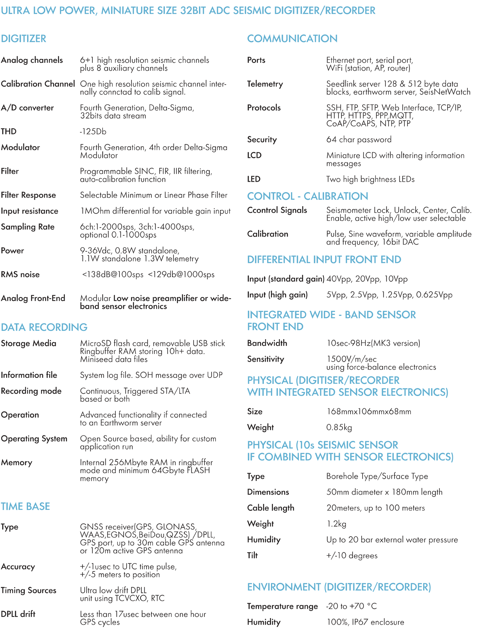 GEObit introduces the GEOsix series, a high-resolution 6+1 analog seismic channels telemetry digitizer/recorder. Equipped with 32-bit ADC converters, it delivers effective resolution surpassing 23.7 bits at 100sps. The instrument boasts a compact size of 168x106x68mm, accompanied by a remarkably low power consumption of 1.2W for 7 channels. It offers a versatile range of sampling rates, from 1 to 2000sps for 6 channels, 1 to 4000sps for 3 channels, and optional support for 0.1 sps. The built-in GNSS receiver, coupled with an ultra-accurate DPLL unit ensuring a time drift of 10e-9 sec, guarantees timing stability even in the absence of a GPS signal. NTP timing is also available.