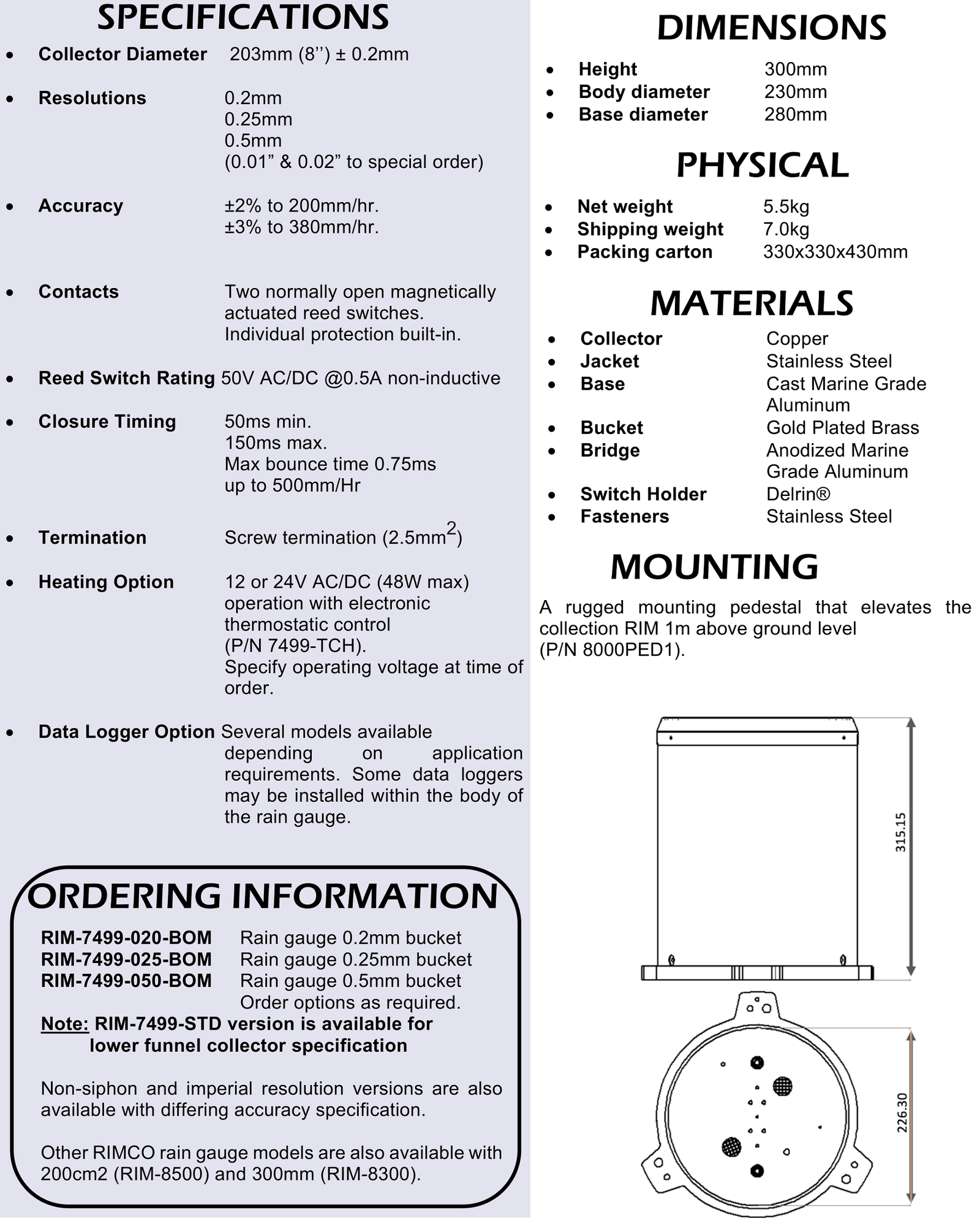 RIM-7499-BOM hadir dengan corong spesifikasi dan kalibrasi yang lebih tinggi dibandingkan versi standar RIM-7499-STD. Alat pengukur hujan RIMCO RIM-7499-BOM diproduksi secara khusus dengan persyaratan yang ketat termasuk dari Biro Meteorologi Australia, Badan Lingkungan Hidup (Inggris) dan DMI Denmark.