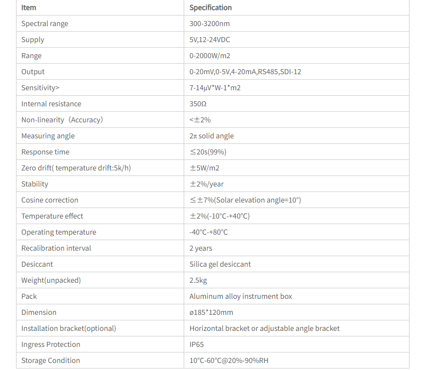 Pyranometer RK200-03 diproduksi berdasarkan prinsip termopile; elemen penginderaan dibuat dengan melilitkan termopile berlapis dengan banyak kontak, permukaannya dilapisi dengan lapisan hitam dengan tingkat penyerapan yang tinggi. Kontak panas pada permukaan sensor, sedangkan sambungan dingin terletak di dalam tubuh, perbedaan suhu antara sambungan panas dan dingin menghasilkan gaya gerak listrik, efek termoelektrik sebanding dengan radiasi matahari. Untuk mengurangi efek suhu sekitar, sirkuit kompensasi suhu dirancang di sini untuk mengurangi efek pada properti produk.