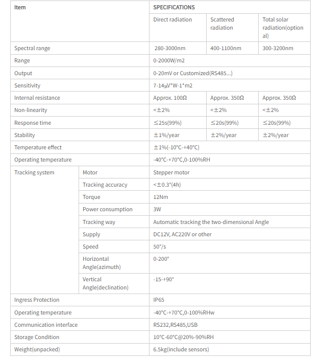 RK200-08 Automatic tracking solar radiation measurement adalah sistem pemantauan radiasi matahari tanpa pengawasan, yang secara akurat dapat mengamati radiasi matahari langsung, tersebar dan total pada saat yang bersamaan. menggunakan sensor Sudut dan teknologi sensor cahaya keseimbangan empat kuadran, pelacakan otomatis matahari, sinar matahari tetap vertikal ke sensor radiasi di dalam kerucut cahaya. Lacak sistem pelacakan lintasan gerak sesuai dengan matahari dan cara cahaya, kombinasi kontrol otomatis 2D, mewujudkan pelacakan waktu nyata otomatis penuh dari matahari. produk dari pangkalan, bangku, sekrup, kotak roda gigi, motor, pengontrol komputer mikro, sensor radiasi, radiasi matahari yang tersebar dan total, daya dan bagian lainnya.