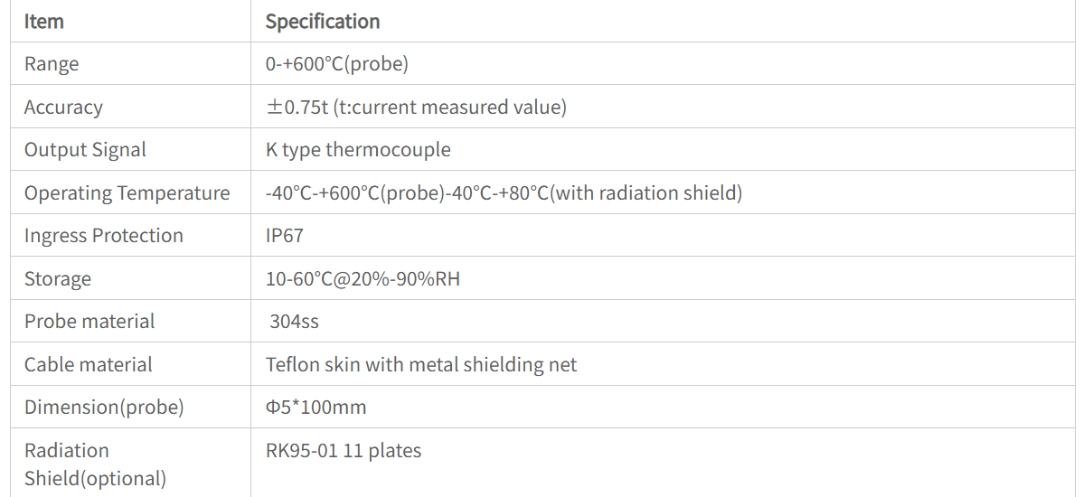 Sensor Suhu Atmosfer RK310-02 diproduksi dengan termokopel tipe K sebagai elemen penginderaan, dan termokopel yang terletak di kepala probe yang dilakukan dengan segel keseluruhan untuk memastikan keakuratannya, Jika perlu, model ini juga dapat dilengkapi dengan pelindung radiasi 11 pelat (RK95-01) untuk melindungi sensor dari radiasi matahari dan hujan.
