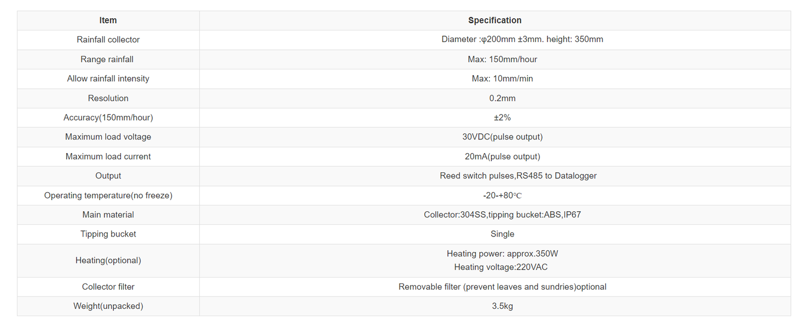 Sensor Curah Hujan Tipping Bucket RK400-01D adalah instrumen untuk menguji curah hujan di alam. Untuk memenuhi kebutuhan transmisi, pemrosesan, perekaman, dan tampilan informasi, jumlah curah hujan diubah menjadi keluaran pulsa. Ini dapat digunakan secara luas di stasiun cuaca, stasiun hidrometri, pertanian & kehutanan, pertahanan & stasiun pemantauan lapangan. Ini dapat memberikan data asli untuk pencegahan banjir, sistem pasokan air, dan pengelolaan air waduk di pabrik.