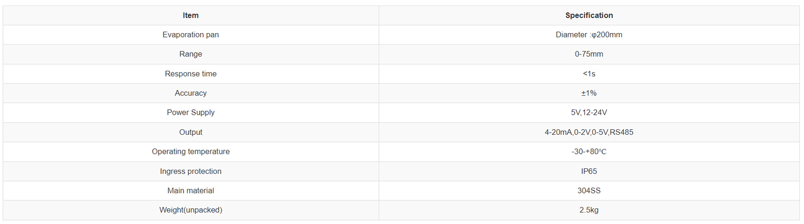 RK400-10 Weight Principle Evaporation Sensor menggunakan prinsip penimbangan presisi tinggi untuk mengukur berat cairan dalam panci penguapan, dan menghitung tingkat kehilangan cairan akibat penguapan dengan mengukur perbedaan berat cairan sebelum dan sesudah pengukuran. Cawan penguapan dibuat dengan baja tahan karat berkualitas tinggi, yang memiliki karakteristik anti korosi dan anti erosi yang baik. Alat ini memastikan keakuratan pengukuran dan dapat digunakan bersama dengan stasiun cuaca otomatis atau perekam penguapan profesional.