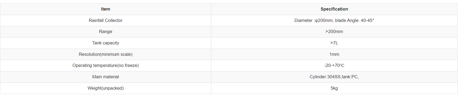 RK400-12 Artificial Observation Rain Gauge adalah alat Pengukur hujan ini dipasang di luar atau di atap. Ketika curah hujan terjadi, air hujan yang diterima oleh mulut penampung hujan disuntikkan ke dalam botol air melalui jaring penyaring. Volume efektif botol air tidak lebih dari 200mm curah hujan, dan nilai skala minimum pada botol adalah curah hujan 1mm, yang dapat dengan mudah digunakan untuk pengamatan curah hujan buatan, setelah setiap curah hujan, port penahan hujan pertama kali diangkat dari silinder luar, dan kemudian botol air dikeluarkan. Setelah mengamati curah hujan, air dicurahkan, dan kemudian botol air dan port penahan hujan dimasukkan ke dalam silinder luar secara bergantian untuk digunakan secara normal