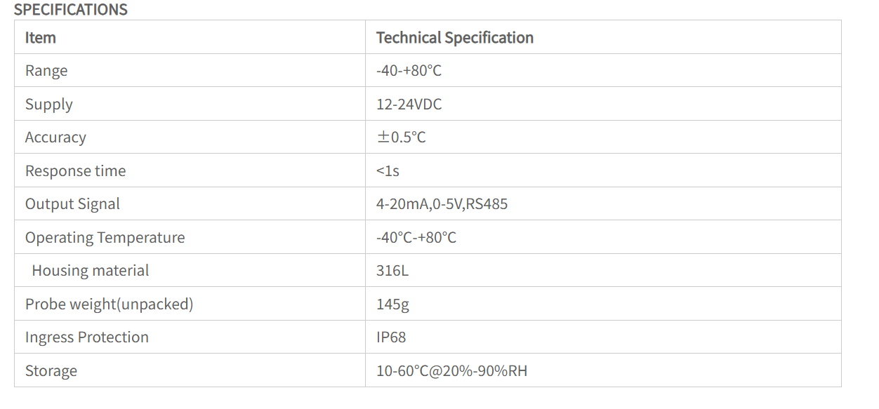 Sensor Suhu Cairan RK500-11 digunakan untuk mengukur suhu media cair, diterapkan pada stasiun meteorologi otomatis, deteksi suhu air kolam atau waduk dan bidang lainnya Sensor dengan ketahanan termal yang presisi sebagai komponen penginderaan, pengambilan sampel dan amplifikasi sinyal internal, penyimpangan nol dan fungsi kompensasi suhu, memiliki karakteristik presisi pengukuran yang tinggi dan stabilitas yang baik.