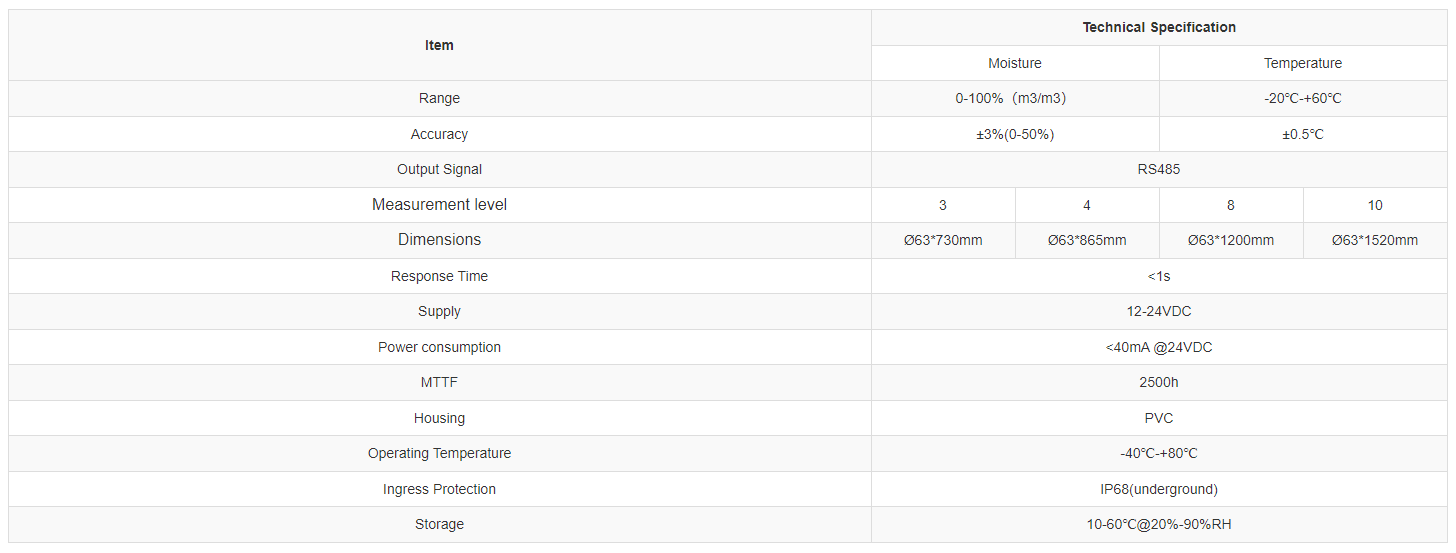 RK520-04 Multilayer Conduit Type Soil Temperature and Humidity Sensor suhu dan kelembaban tanah berdasarkan prinsip FDR (Frequancy Domain Reflection), menggunakan metode pengukuran kelembaban tanah tipe tabung berlapis FDR, sesuai dengan perubahan frekuensi gelombang elektromagnetik yang dipancarkan oleh detektor pada bahan koefisien dielektrik yang berbeda, dihitung dari kelembaban tanah yang diukur. Mampu melakukan pengukuran simultan terhadap kedalaman kelembaban tanah dan suhu tanah yang berbeda. Rangkaian produk ini dapat digunakan secara luas dalam pemantauan kekeringan, penelitian tanah, irigasi cerdas, prediksi produksi pertanian, dan tanah longsor.