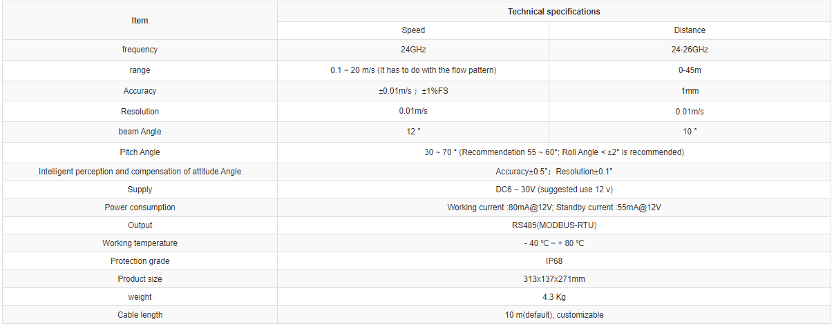 RKL-07 Radar Flowmeter dapat secara terus menerus mengukur aliran air sungai dan saluran terbuka, dikombinasikan dengan pengukur aliran radar dan pengukur ketinggian air radar, kecepatan permukaan dan ketinggian air diukur dengan cara non-kontak. Untuk bagian saluran yang teratur, gunakan rumus matematika konvensional untuk menghitung hasil aliran. Untuk bagian sungai yang tidak beraturan, hasil laju aliran diperoleh dengan menggunakan metode titik dan perhitungan kalkulus. Metode pengukuran non-kontak tidak terpengaruh oleh sedimen, gulma air, dan puing-puing lainnya, sehingga mengurangi biaya pemeliharaan dan meningkatkan keandalan.